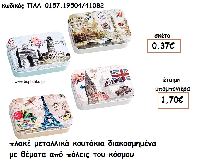 ΚΟΥΤΙ ΜΕΤΑΛΛΙΚΟ ΠΛΑΚΕ ΚΑΘΕΤΟ ΜΕ ΠΟΛΕΙΣ ΑΠΟ ΤΟΝ ΚΟΣΜΟ ΓΙΑ ΜΠΟΜΠΟΝΙΕΡΕΣ ΒΑΠΤΙΣΗΣ ΠΑΛ-0157.19504/41082