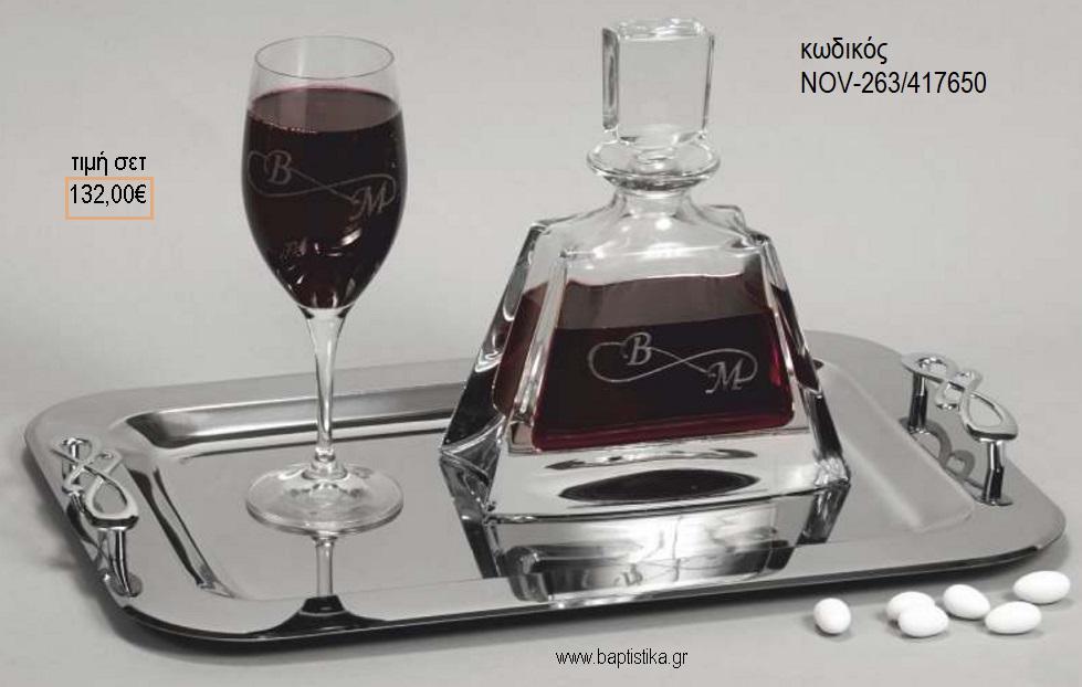 Το σετ περιέχει 1 καράφα , 1 ποτήρι κρασιού , 3 ποτήρια και 1 δίσκο.