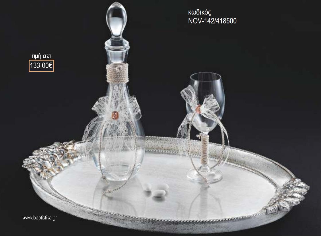 Το σετ περιέχει 1 καράφα , 1 ποτήρι κρασιού , 2 ποτήρια σαμπάνιας και 1 δίσκο.