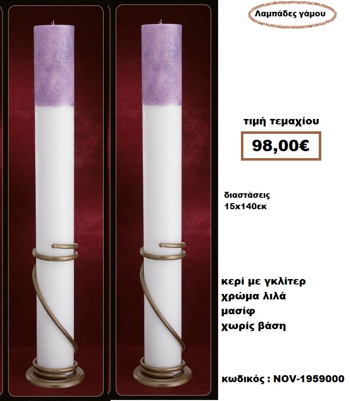 ", "category" : "ΛΑΜΠΑΔΕΣ & ΚΕΡΙΑ γάμου", "sku": "16767", "offers": { "@type": "Offer", "priceCurrency": "EUR", "price": "98", "priceValidUntil": "2025-12-21", "url" : "https://www.vip-mpomponiera.gr/portal/proionta/goneis/lampades-keria-gamou-se-oikonomikes-fthines-times/lampada--keria-gamou-me-gliter-lila-masif-xoris-vasi-nov-1959000-detail", "itemCondition": "http://schema.org/NewCondition", "availability": "http://schema.org/InStock" } }