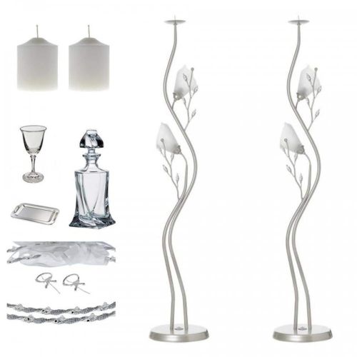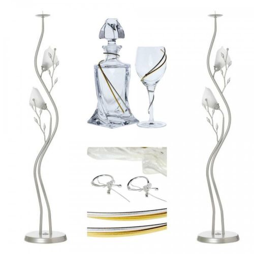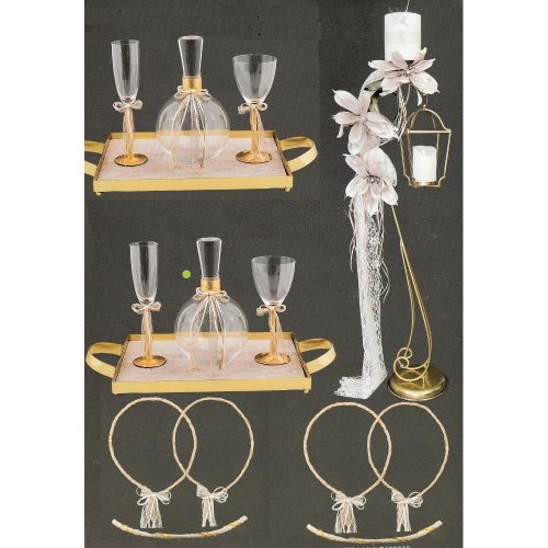 κηροστάτες , δίσκος , μποτίλι , ποτήρια , στέφανα πακέτα γάμου