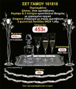 Η τιμή περιλαμβάνει 2 φωτιστικά δαπέδου (ινοξ,μπρονζέ η σκουριά) στέφανα επάργυρα αμετάβλητα,δίσκος ινοξ αμετάβλητος,μποτίλια κρυστάλλινη,3 ποτήρια κρυστάλλινα και ΦΠΑ