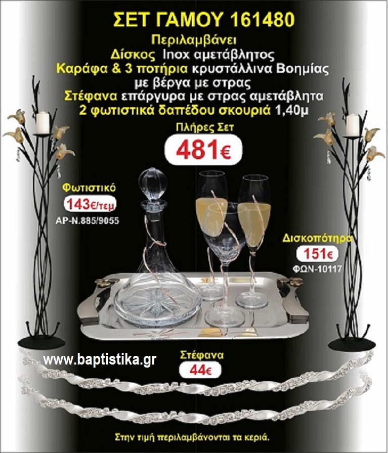 Η τιμή περιλαμβάνει 2 φωτιστικά δαπέδου (ινοξ,μπρονζέ η σκουριά) στέφανα επάργυρα αμετάβλητα,δίσκος ινοξ αμετάβλητος,μποτίλια κρυστάλλινη,3 ποτήρια κρυστάλλινα και ΦΠΑ