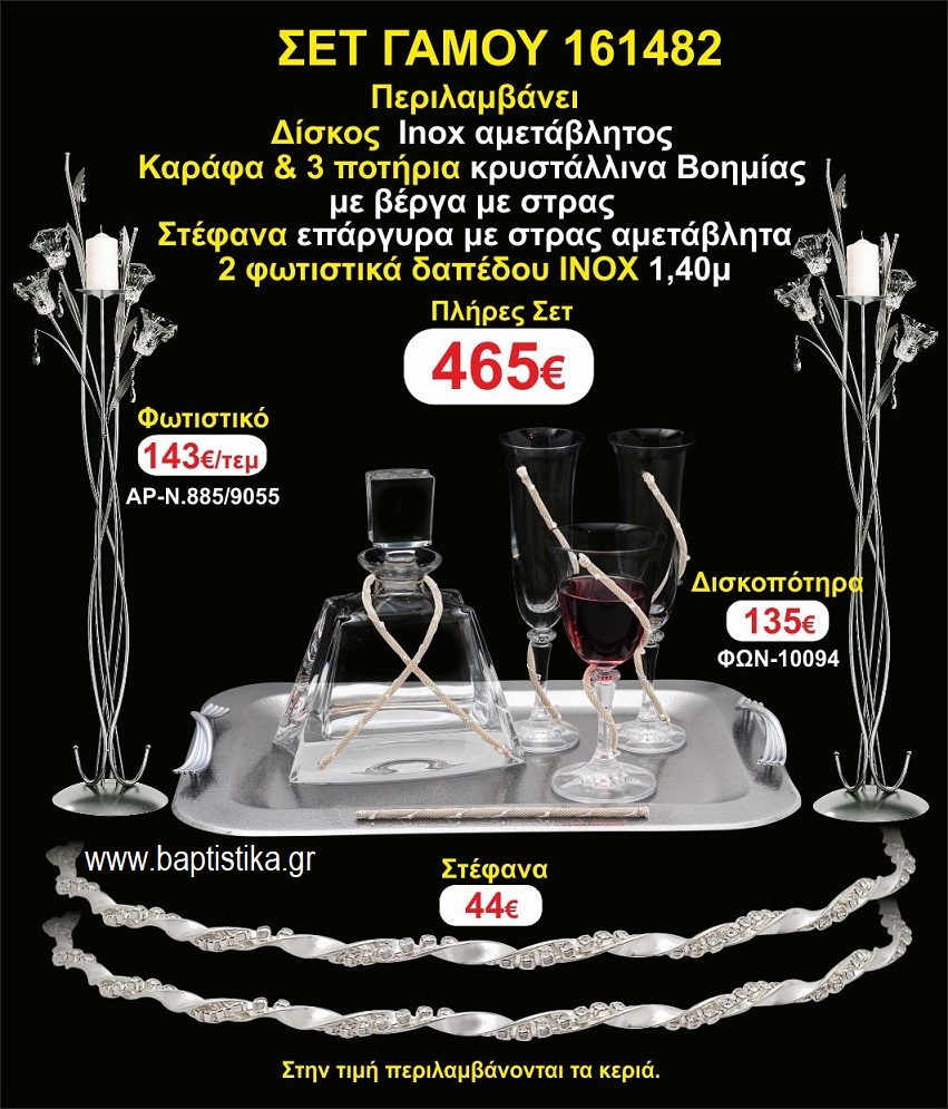 Η τιμή περιλαμβάνει 2 φωτιστικά δαπέδου (ινοξ,μπρονζέ η σκουριά) στέφανα επάργυρα αμετάβλητα,δίσκος ινοξ αμετάβλητος,μποτίλια κρυστάλλινη,3 ποτήρια κρυστάλλινα και ΦΠΑ
