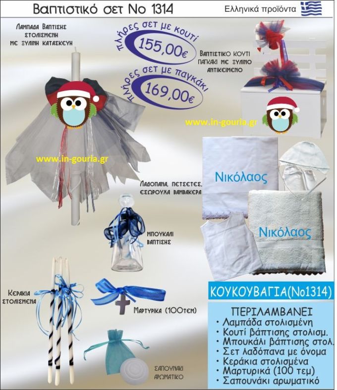 ", "category" : "ΚΟΥΚΟΥΒΑΓΙΕΣ μπομπονιέρες βάπτισης,στολισμοί εκκλησίας,βαπτιστικά πακέτα,δώρα πάρτι, μαιευτηρίου", "sku": "7141", "offers": { "@type": "Offer", "priceCurrency": "EUR", "price": "155", "priceValidUntil": "2025-12-22", "url" : "https://www.vip-mpomponiera.gr/portal/proionta/paketa-vaptisis/145-164-vaptistika-set-paketa-gia-nono/koukouvagia-no1314-vaptistiko-set-paketo-vaptisis-gia-xeimona-xristoygenna-protoxronia-mono-155-detail", "itemCondition": "http://schema.org/NewCondition", "availability": "http://schema.org/InStock" } }