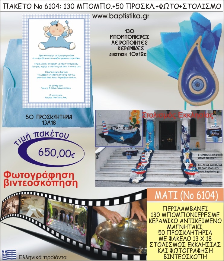 ΜΑΤΑΚΙ 650€ ΠΑΚΕΤΟ ΒΑΠΤΙΣΗΣ (130 ΜΠΟΜΠΟΝΙΕΡΕΣ,50 ΠΡΟΣΚΛΗΤΗΡΙΑ,ΣΤΟΛΙΣΜΟΣ ΕΚΚΛΗΣΙΑΣ,ΦΩΤΟΓΡΑΦΗΣΗ-ΒΙΝΤΕΟΣΚΟΠΗΣΗ) ΝΟ6104