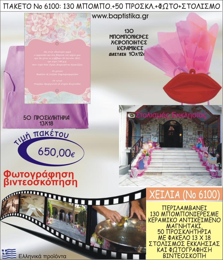 ΧΕΙΛΗ 650€ ΠΑΚΕΤΟ ΒΑΠΤΙΣΗΣ (130 ΜΠΟΜΠΟΝΙΕΡΕΣ,50 ΠΡΟΣΚΛΗΤΗΡΙΑ,ΣΤΟΛΙΣΜΟΣ ΕΚΚΛΗΣΙΑΣ,ΦΩΤΟΓΡΑΦΗΣΗ-ΒΙΝΤΕΟΣΚΟΠΗΣΗ) ΝΟ6100
