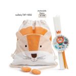 λαμπάδα διακοσμημένη με στρογγυλή παράσταση λιοντάρι και ζωγραφιστή κορώνα στο κερί και υφασμάτινο σακίδιο backpack με σχέδιο λιονταράκι .