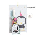 λαμπάδα διακοσμημένη με γκρι ύφασμα αστεράκια και ξύλινο κοπτικό πιγκουίνος και ξύλινο καδράκι εκτυπωμένο με την φιγούρα του πιγκουίνου.