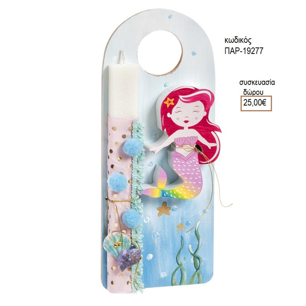 ξύλινη διακοσμητική φιγούρα της γοργόνας και ξύλινο διακοσμητικό πόρτας στο οποίο είναι ζωγραφισμένος ο βυθός της θάλλασσας