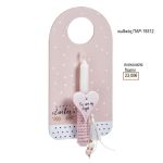 λαμπάδα διακοσμημένη με ροζ γύψινη καρδιά και ροζ κορδόνι και ξύλινη πλάτη εκτυπωμένη σε ροζ πουά απόχρωση.