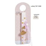 λαμπάδα ζωγραφισμένη με πολύχρωμα πουά και διακοσμημένη με μεταλλικό χρυσό κύκνο, ροζ δαντέλα και λευκό και ξύλινο διακοσμητικό πόρτας εκτυπωμένο σε ροζ πουά αποχρώσεις .