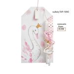 λαμπάδα διακοσμημένη με υφασμάτινη ροζ κορδέλα με πουά χρυσό με μεταλλικό μοτίφ κύκνος και ξύλινη πλάτη ζωγραφισμένη με κύκνο με κορώνα .