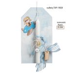 λαμπάδα διακοσμημένη με υφασμάτινη λευκή κορδέλα με σιέλ γαζί και μεταλλικό μοτίφ χρυσό αεροπλανάκι και ξύλινη κρεμαστή ετικέτα ζωγραφισμένη με αεροπλανάκι σε σιέλ αποχρώσεις .