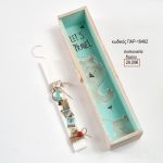 λαμπάδα η οποία είναι διακοσμημένη με γραμματόσημα και μεταλλικό μοτίφ υδρόγειος και ξύλινο κουτί με plexiglass ζωγραφισμένο με το γύρο του κόσμου σε βεραμάν αποχρώσεις .