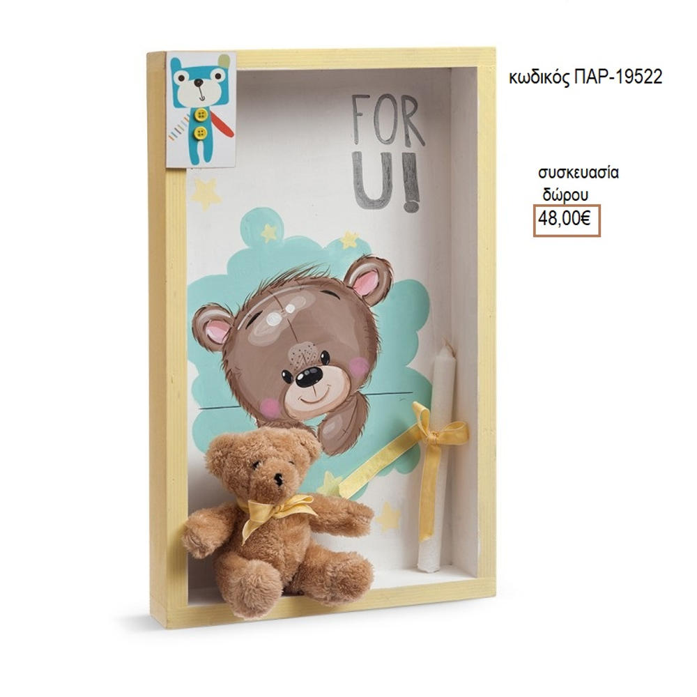 πασχαλινή λαμπάδα με φιόγκο , λούτρινο καφέ αρκουδάκι και ξύλινη κορνίζα ζωγραφιστή.