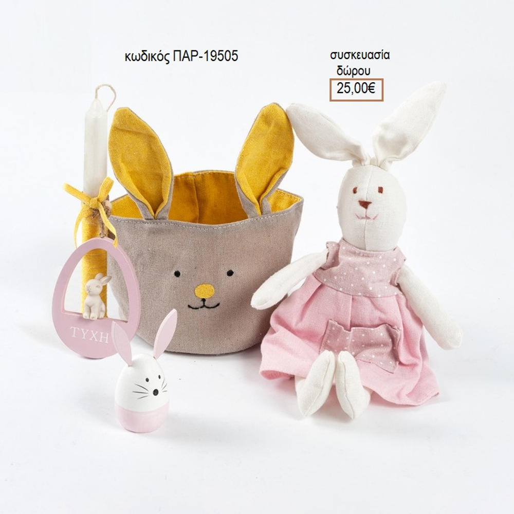 υφασμάτινο επιτραπέζιο καλαθάκι με σχέδιο λαγουδάκι , υφασμάτινο λαγουδάκι με ροζ φόρεμα και ξύλινο διακοσμητικό επιτραπέζιο κουνελάκι.
