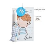 λαμπάδα διακοσμημένη με κορδόνια γιούτα σιέλ και υφασμάτινο κρεμαστό ψαράκι , χάρτινη ετικέτα με σιέλ καραβάκι και ξύλινη πλάτη εκτυπωμένο με το φιγούρα από ναυτάκι.