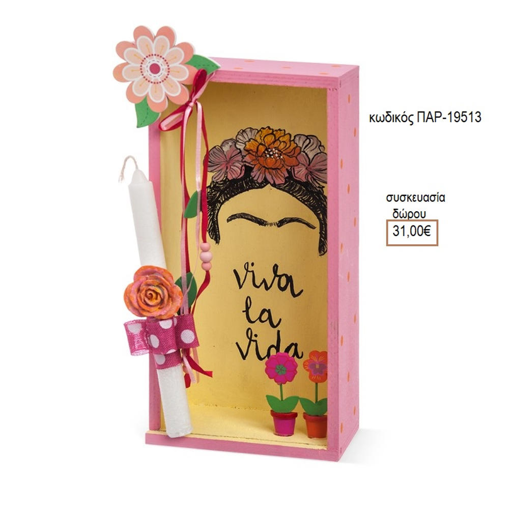 λαμπάδα διακοσμημένη με ροζ print ύφασμα με πουά λευκό και polyester διακοσμητικό τριαντάφυλλο σε ροζ αποχρώσεις και ξύλινο κουτί με plexiglass ζωγραφισμένο με το περίγραμμα της Frida kahlo .