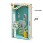 λαμπάδα διακοσμημένη με ξύλινο διακοσμητικό λαγουδάκι σε σχήμα αυγού και ξύλινο κουτί με plexiglass ζωγραφισμένο με λαγουδάκι σε βεραμάν φόντο.
