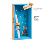 λαμπάδα διακοσμημένη με μεταλλικό μοτίφ κορώνα και ξύλινο κουτί με plexiglass ζωγραφισμένο με τον μικρό πρίγκιπα .