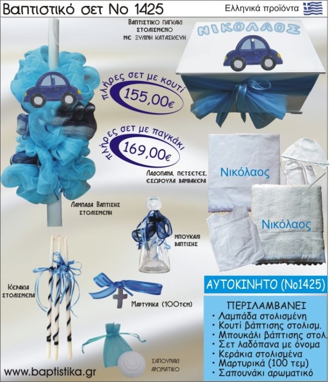 ", "category" : "ΑΥΤΟΚΙΝΗΤΑ OXHMATA & ΜΕΤΑΦΟΡΙΚΑ ΜΕΣΑ μπομπονιέρες βάπτισης,στολισμοί εκκλησίας,βαπτιστικά πακέτα,δώρα πάρτι, μαιευτηρίου", "sku": "8983", "offers": { "@type": "Offer", "priceCurrency": "EUR", "price": "155", "priceValidUntil": "2025-12-21", "url" : "https://www.vip-mpomponiera.gr/portal/proionta/thema-agori/aftokinita-oxhmata-metaforika-mesa-bomponieres-vaptisis-stolismoi-ekklisias-vaptistika-paketa-dora-parti-maieftiriou/aftokinito-no1425-vaptistiko-set-paketo-vaptisis-mono-155-detail", "itemCondition": "http://schema.org/NewCondition", "availability": "http://schema.org/InStock" } }