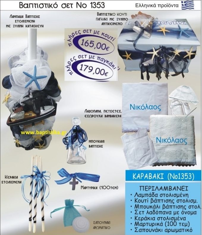 ", "category" : "ΚΑΡΑΒΙΑ-ΒΑΡΚΕΣ μπομπονιέρες βάπτισης,στολισμοί εκκλησίας,βαπτιστικά πακέτα,δώρα πάρτι, μαιευτηρίου", "sku": "7625", "offers": { "@type": "Offer", "priceCurrency": "EUR", "price": "165", "priceValidUntil": "2025-12-22", "url" : "https://www.vip-mpomponiera.gr/portal/proionta/thema-agori/karavia-varkes-bomponieres-vaptisis-stolismoi-ekklisias-vaptistika-paketa-dora-parti-maieftiriou/karavaki-no1353-vaptistiko-set-paketo-vaptisis-mono-165-detail", "itemCondition": "http://schema.org/NewCondition", "availability": "http://schema.org/InStock" } }Η ΤΙΜΗ ΠΕΡΙΛΑΜΒΑΝΕΙ ΠΛΗΡΕΣ ΒΑΠΤΙΣΤΙΚΟ ΣΕΤ ΟΠΩΣ ΒΛΕΠΕΤΕ ΣΤΗΝ ΕΙΚΟΝΑ ΠΟΥ ΠΕΡΙΕΧΕΙ..