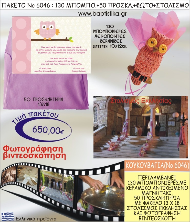 ΚΟΥΚΟΥΒΑΓΙΑ 650€ ΠΑΚΕΤΟ ΒΑΠΤΙΣΗΣ (130 ΜΠΟΜΠΟΝΙΕΡΕΣ,50 ΠΡΟΣΚΛΗΤΗΡΙΑ,ΣΤΟΛΙΣΜΟΣ ΕΚΚΛΗΣΙΑΣ,ΦΩΤΟΓΡΑΦΗΣΗ-ΒΙΝΤΕΟΣΚΟΠΗΣΗ) ΝΟ6046