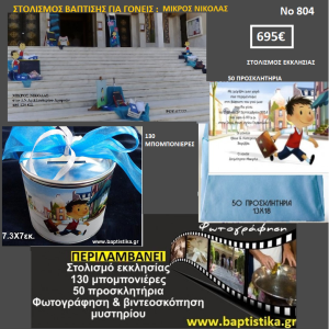 ΜΙΚΡΟΣ ΝΙΚΟΛΑΣ ΠΑΚΕΤΟ ΒΑΠΤΙΣΗΣ (130 ΜΠΟΜΠΟΝΙΕΡΕΣ,50 ΠΡΟΣΚΛΗΤΗΡΙΑ,ΦΩΤΟΓΡΑΦΗΣΗ ΚΑΙ ΒΙΝΤΕΟΣΚΟΠΗΣΗ) Νο804