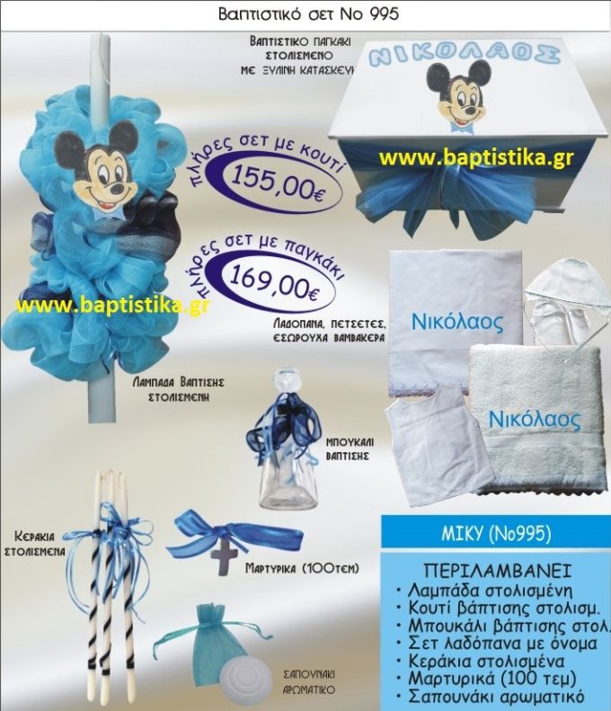", "category" : "ΜΙΚΥ-ΜΙΝΙ Micky-Minnie DISNEY μπομπονιέρες βάπτισης,στολισμοί εκκλησίας,βαπτιστικά πακέτα,δώρα πάρτι, μαιευτηρίου", "sku": "6819", "offers": { "@type": "Offer", "priceCurrency": "EUR", "price": "155", "priceValidUntil": "2025-12-21", "url" : "https://www.vip-mpomponiera.gr/portal/proionta/thema-agori/miky-mini-micky-minnie-disney-bomponieres-vaptisis-stolismoi-ekklisias-vaptistika-paketa-dora-parti-maieftiriou/miky-no995-vaptistiko-set-paketo-vaptisis-mono-155-se-oikonomikes-kai-fthines-times-megales-prosfores-entos-katastimatos-peiraias-pagkrati-ilisia-goudi-vari-paiania-kai-se-olokliri-tin-ellada-detail", "itemCondition": "http://schema.org/NewCondition", "availability": "http://schema.org/InStock" } }