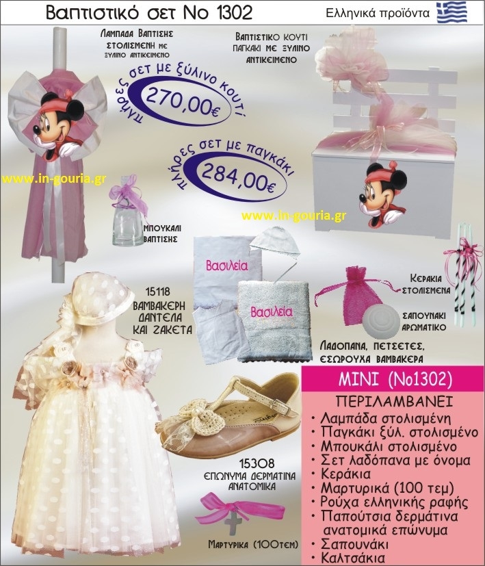 ", "category" : "ΜΙΚΥ-ΜΙΝΙ Micky-Minnie DISNEY μπομπονιέρες βάπτισης,στολισμοί εκκλησίας,βαπτιστικά πακέτα,δώρα πάρτι, μαιευτηρίου", "sku": "7136", "offers": { "@type": "Offer", "priceCurrency": "EUR", "price": "270", "priceValidUntil": "2025-12-21", "url" : "https://www.vip-mpomponiera.gr/portal/proionta/thema-agori/miky-mini-micky-minnie-disney-bomponieres-vaptisis-stolismoi-ekklisias-vaptistika-paketa-dora-parti-maieftiriou/mini-no1302-vaptistiko-set-paketo-vaptisis-gia-xeimona-xristoygenna-protoxronia-mono-270-detail", "itemCondition": "http://schema.org/NewCondition", "availability": "http://schema.org/InStock" } }