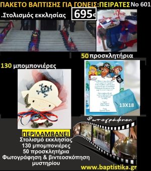 ΠΕΙΡΑΤΗΣ ΠΑΚΕΤΟ ΒΑΠΤΙΣΗΣ(130 ΜΠΟΜΠΟΝΙΕΡΕΣ,50 ΠΡΟΣΚΛΗΤΗΡΙΑ,ΣΤΟΛΙΣΜΟΣ ΕΚΚΛΗΣΙΑΣ,ΦΩΤΟΓΡΑΦηΣΗ & ΒΙΝΤΕΟΣΚΟΠΗΣΗ)