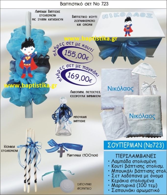 Η ΤΙΜΗ ΠΕΡΙΛΑΜΒΑΝΕΙ ΦΠΑ,ΠΛΗΡΕΣ ΒΑΠΤΙΣΤΙΚΟ ΣΕΤ ΠΟΥ ΠΕΡΙΕΧΕΙ..ΣΤΟΛΙΣΜΕΝΗ ΛΑΜΠΑΔΑ ΜΕ ΞΥΛΙΝΗ ΖΩΓΡΑΦΙΣΜΕΝΗ ΚΑΤΑΣΚΕΥΗ ΤΟ ΘΕΜΑ-- ΣΤΟΛΙΣΜΕΝΟ ΚΟΥΤΙ ΞΥΛΙΝΟ ΜΕ ΖΩΓΡΑΦΙΣΜΕΝΟ ΤΟ ΘΕΜΑ ΚΑΙ ΤΟ ΟΝΟΜΑ ΤΟΥ ΜΩΡΟΥ--ΜΠΟΥΚΑΛΙ ΣΤΟΛΙΣΜΕΝΟ--3 ΚΕΡΑΚΙΑ ΣΤΟΛΙΣΜΕΝΑ--100 ΜΑΡΤΥΡΙΚΑ--ΛΑΔΟΠΑΝΟ & ΠΕΤΣΕΤΑ ΜΕΓΑΛΗ ΜΕ ΚΕΝΤΗΜΕΝΟ ΤΟ ΟΝΟΜΑ ΤΟΥ ΜΩΡΟΥ ΣΑΣ--1 ΠΕΤΣΕΤΑ ΓΙΑ ΤΟΝ ΠΑΠΑ--ΕΣΩΡΟΥΧΑ--ΣΚΟΥΦΑΚΙ--