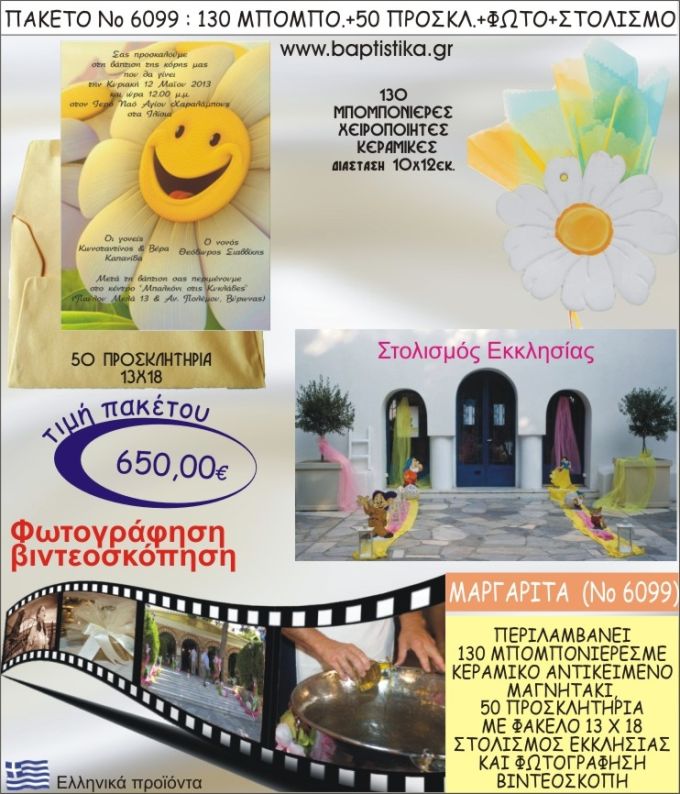 ΜΑΡΓΑΡΙΤΑ 650€ ΠΑΚΕΤΟ ΒΑΠΤΙΣΗΣ (130 ΜΠΟΜΠΟΝΙΕΡΕΣ,50 ΠΡΟΣΚΛΗΤΗΡΙΑ,ΣΤΟΛΙΣΜΟΣ ΕΚΚΛΗΣΙΑΣ,ΦΩΤΟΓΡΑΦΗΣΗ-ΒΙΝΤΕΟΣΚΟΠΗΣΗ) ΝΟ6099
