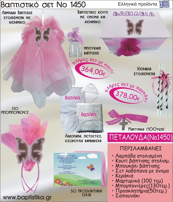", "category" : "ΠΕΤΑΛΟΥΔΕΣ μπομπονιέρες βάπτισης,στολισμοί εκκλησίας,βαπτιστικά πακέτα,δώρα πάρτι, μαιευτηρίου", "sku": "8926", "offers": { "@type": "Offer", "priceCurrency": "EUR", "price": "364", "priceValidUntil": "2025-12-22", "url" : "https://www.vip-mpomponiera.gr/portal/proionta/thema-koritsi/petaloudes-bomponieres-vaptisis-stolismoi-ekklisias-vaptistika-paketa-dora-parti-maieftiriou/petalouda-no1450-paketo-vaptisis-vaptistiko-set-plires-130-bomponieres-50-prosklitiria-mono-364-detail", "itemCondition": "http://schema.org/NewCondition", "availability": "http://schema.org/InStock" } }