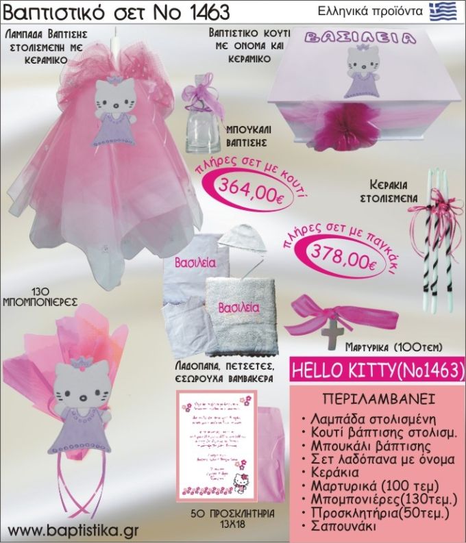 ", "category" : "ΧΕΛΛΟ ΚΙΤΤΥ-HELLO KITTY μπομπονιέρες βάπτισης,στολισμοί εκκλησίας,βαπτιστικά πακέτα,δώρα πάρτι, μαιευτηρίου", "sku": "8931", "offers": { "@type": "Offer", "priceCurrency": "EUR", "price": "364", "priceValidUntil": "2025-12-21", "url" : "https://www.vip-mpomponiera.gr/portal/proionta/thema-koritsi/xello-kitty-hello-kitty-bomponieres-vaptisis-stolismoi-ekklisias-vaptistika-paketa-dora-parti-maieftiriou/xeloou-kitty-no1463-paketo-vaptisis-vaptistiko-set-plires-130-bomponieres-50-prosklitiria-mono-364-detail", "itemCondition": "http://schema.org/NewCondition", "availability": "http://schema.org/InStock" } }